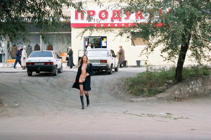 Блондинка гуляет по городу в пальто и черных чулках. Часть 2.
