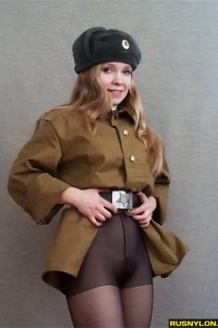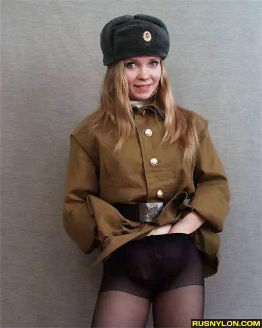 Фотосессия девушки к 23 февраля в колготках и гимнастерке.