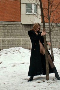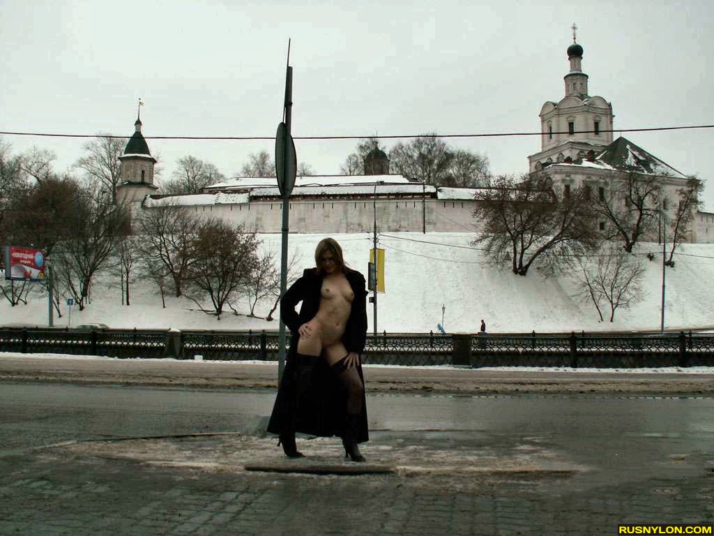 Голая девушка в пальто и чулках гуляет по городу. Эксгибиционистки в чулках.